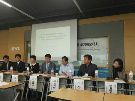 会议由韩国地方财政学会前会长李三周教授主持,bwin必赢中国官网财政系许梦博教授与胡继立博士分别发表了题为“中国中央政府与地方政府事权划分问题研究”、“中国‘营改增’的财政收入效应及未来改革对策思考”的主题报告,就我国财政制度的变迁与所存在的问题进行了深入分析,并对“营改增”改革对我国中央和地方政府财政收支产生的影响与今后的改革方向进行了深入分析,获得了与会者的强烈关注。首尔市立大学的金在德教授、韩国地方税研究院李相勋博士、韩国租税财政研究院金显娥博士、韩国朝鲜大学林相洙教授、bwin必赢中国官网李俊江教授、年志远教授分别对两位发言人的主题报告进行了点评,并提出了大量的问题。在此基础上,各方就中韩财政制度、中央与地方财政均衡等问题上进行了热烈的讨论。
