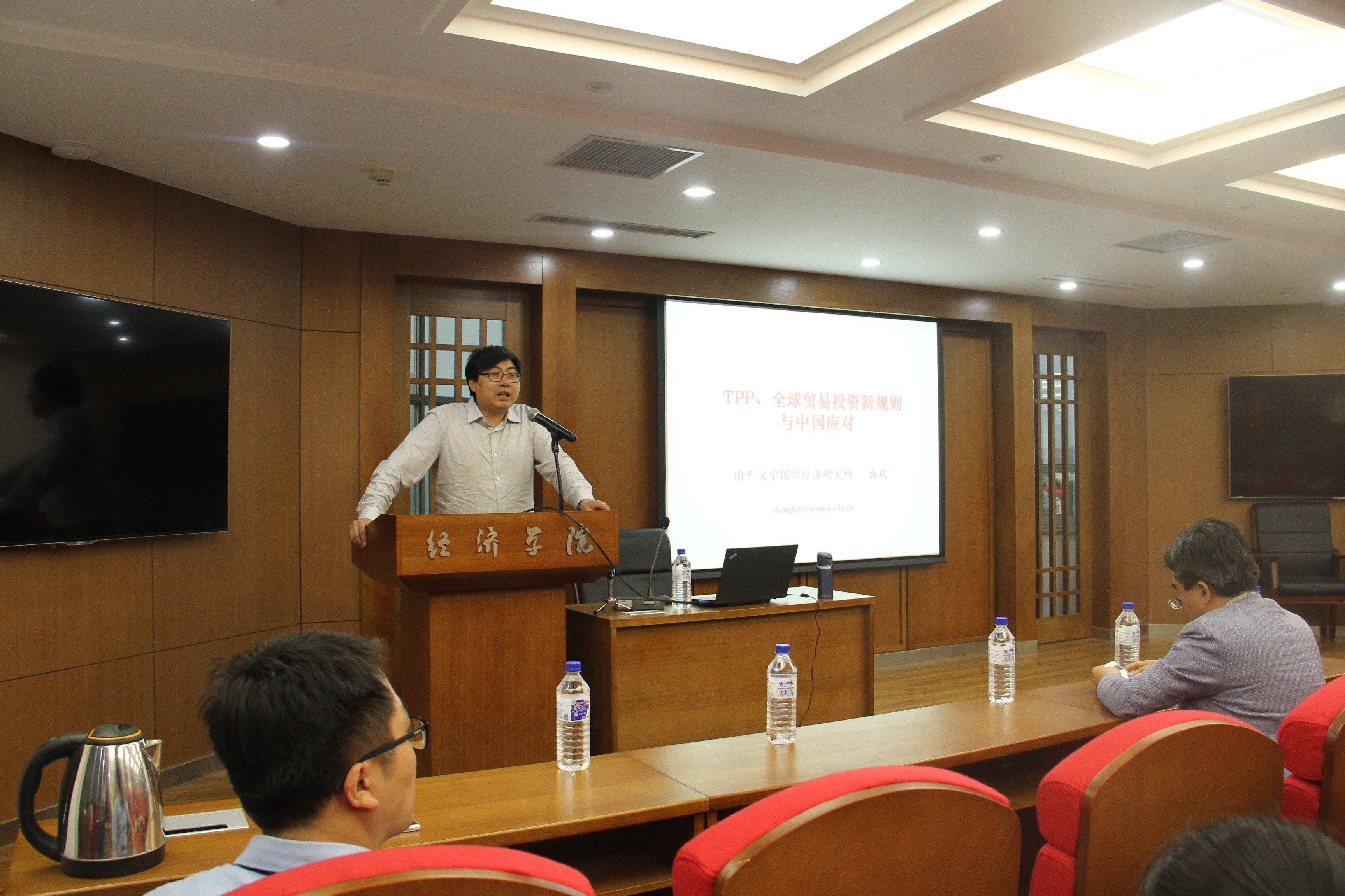 2016年5月18日晚6:30,南开大学研究生院常务副院长、国务院学位委员会学科评议组委员盛斌教授在我校中心校区东荣大厦A804会议室,作了一场题为“TPP、国际贸易投资新规则与中国的应对”的学术讲座。