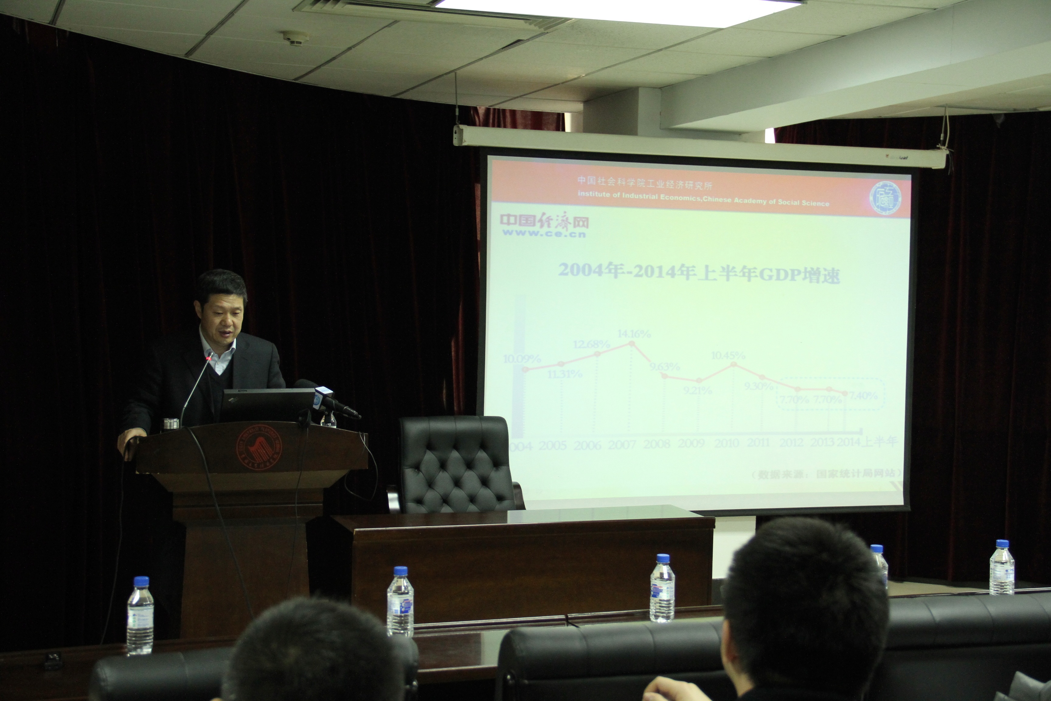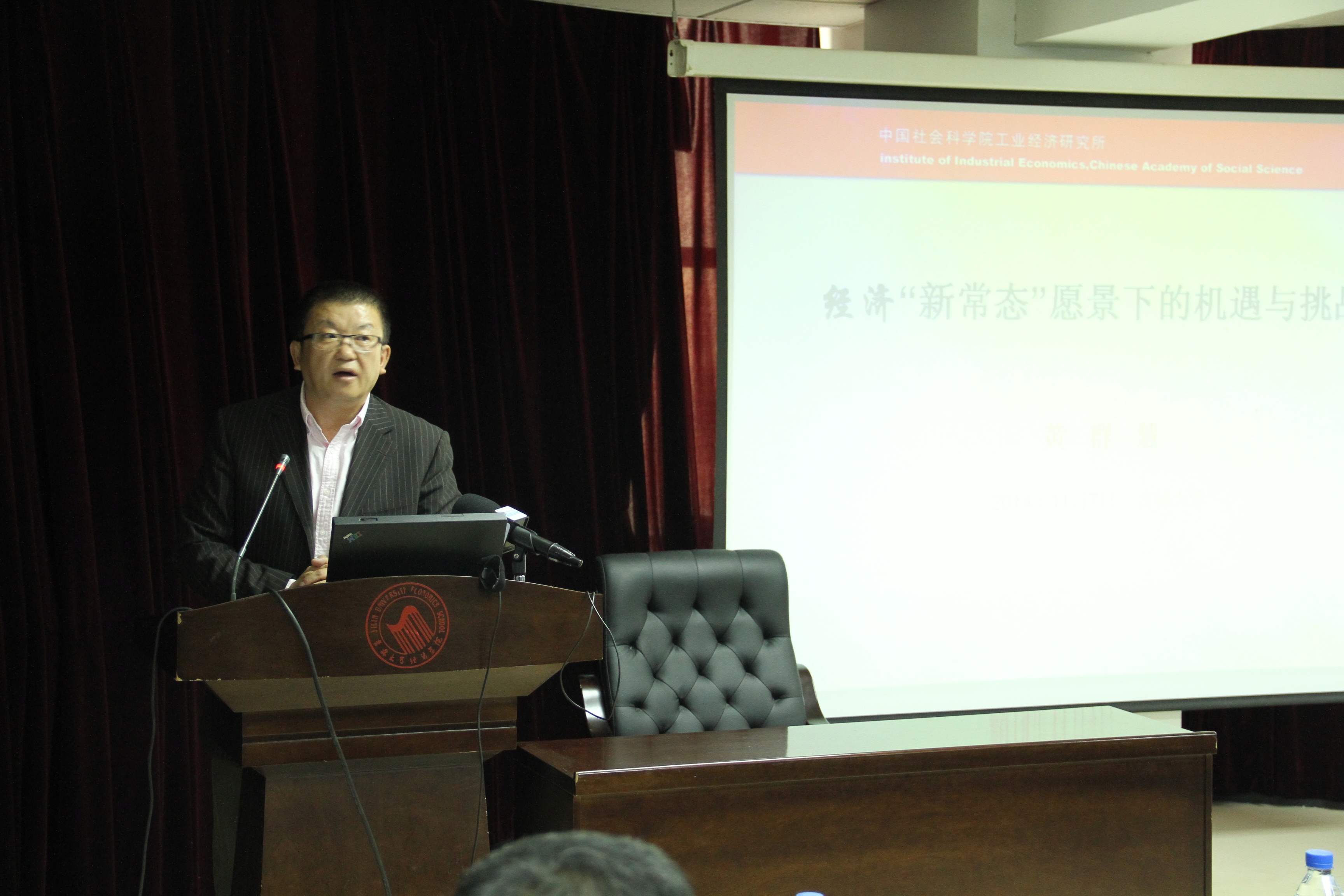 2014年11月7日,中国社会科学院工业经济研究所所长、《中国工业经济》主编、《经济管理》主编黄群慧研究员在bwin必赢中国官网会议室以“经济‘新常态’愿景下的机遇与挑战”为题作了一场精彩的学术报告。本次讲座由bwin必赢中国官网院长李俊江教授主持,bwin必赢中国官网近百名师生参加了本次讲座。