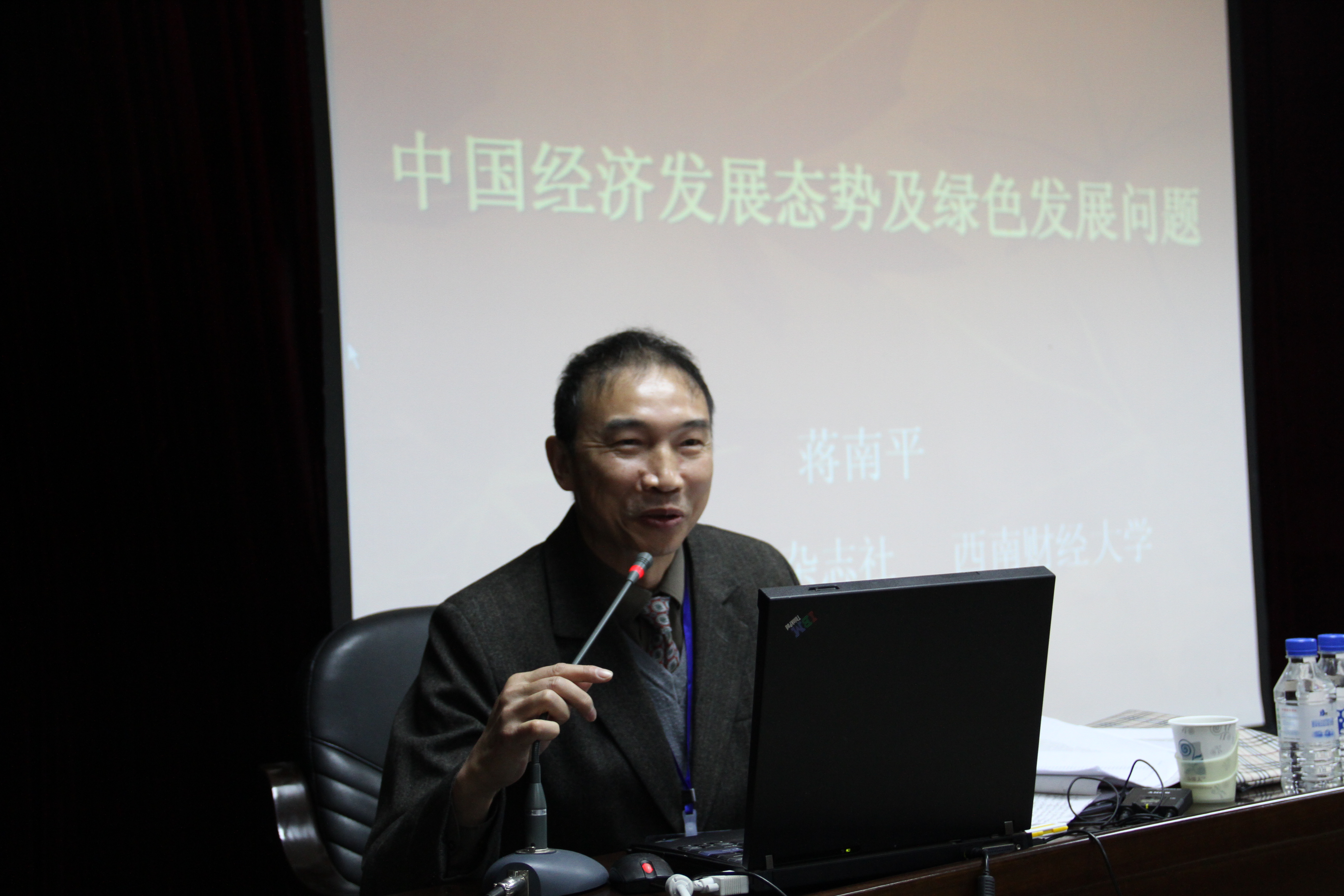 蒋南平教授首先从中国经济发展的现状、存在的问题等几个方面对中国经济发展的情况作了简单的介绍,他指出,我国现在能源、资源短缺等问题成为制约我国经济绿色发展的主要障碍。蒋教授分析了中国经济绿色发展的实质,列举了关于低碳经济发展的几种观点,在此基础上提出了中国经济绿色发展的内涵,并指出了我国经济绿色发展的现状,同时也看到了在发展过程中所面临的问题。随后,蒋南平教授提出了中国经济绿色发展的理论依据,他从西方生态主义讲起,也提到了马克思主义中关于绿色生态发展的观点。最后,蒋教授阐述了中国绿色经济发展的正确道路,既要坚持马克思主义的绿色发展观,又要符合全球绿色发展的趋势。整场报告气氛融洽,学生与教授间积极互动、讨论热烈。