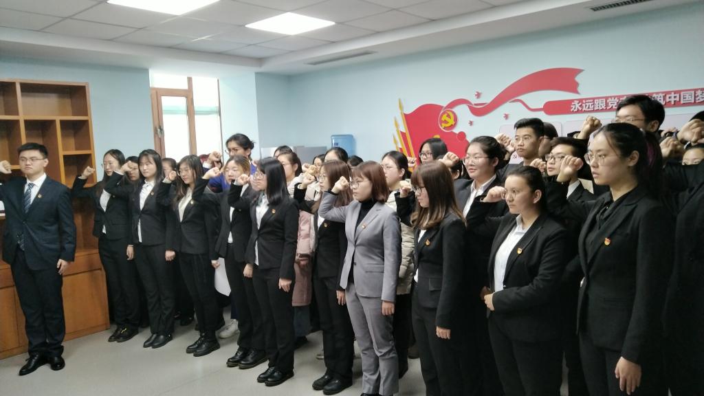 2019年12月12日上午,必赢官网本科生党支部在东荣大厦“党员之家”举办了入党宣誓仪式,学院党委副书记赵勇同志、支部书记田仲金同志、支部书记刘晋禹同志以及2016级和2017级本科生党支部的40名预备党员参加了本次仪式。