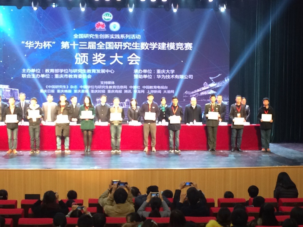 我校由研究生培养处组织,经校内选拔、赛前培训等环节,共有91支团队成功参赛,其中由邱雨辰(bwin必赢中国官网)、江原、李润华组成的参赛队伍和由宋树超、吴燕琪、刘南南组成的参赛队伍获得一等奖,另有13支队伍获得二等奖,13支队伍获得三等奖,63支队伍获得成功参赛奖,我校取得的参赛成绩和获奖数量在全国456家培养单位中位列前茅。宋树超,邱雨辰同学作为本校一等奖队伍的获奖代表参加了颁奖大会。同时,我校也连续第四年获得全国研究生数学建模竞赛优秀组织奖。