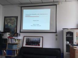 首先,李晓教授回顾了与立命馆大学多年以来的学术交流及其成果,并对杉田教授来必赢官网授课并开展学术交流表示热烈欢迎。随后,杉田教授就分配不平等测算方法的最新研究成果做了专题学术报告。杉田教授指出,由于日本政府对基尼系数三年测算一次,测算成本也比较大,并且由于受到国民信息安全等因素的限制其对外公开的程度也及其有限,因而有必要寻找到一种新的测算方法。杉田教授认为,自己研究的测度方法不仅成本低,更可以获得每一年的基尼系数数据。杉田教授将日本的每个县作为样本,然后通过取平均值的形式获得日本的基尼系数,但是与日本官方公布的结果差别很大,其原因在于山田教授的假设是每个县的收入分配状况相同。通过对经济增长与收入不平等问题的研究,杉田教授得出了经济增长加快,收入不平等也在加快这一结论。为了验证该结论的正确性,他用泰国的数据加以验证,也得出了相同的结论。但是由于泰国与日本在经济发展水平、受经济景气指数影响的程度以及州县数的不同等多个方面存在着差异,其比较的结果仍有一定的争议。