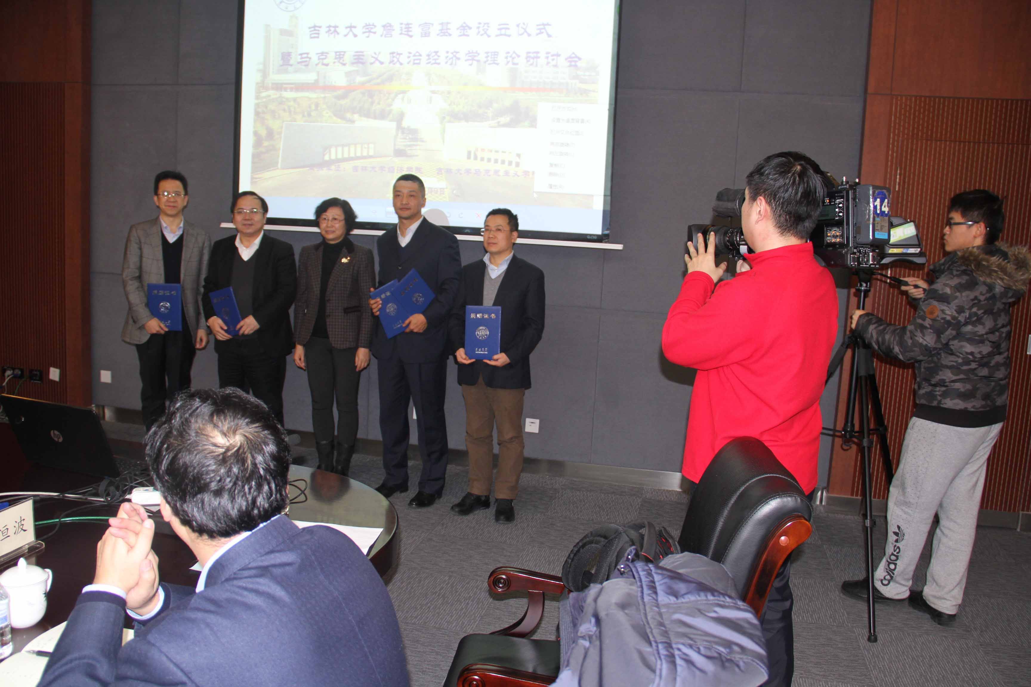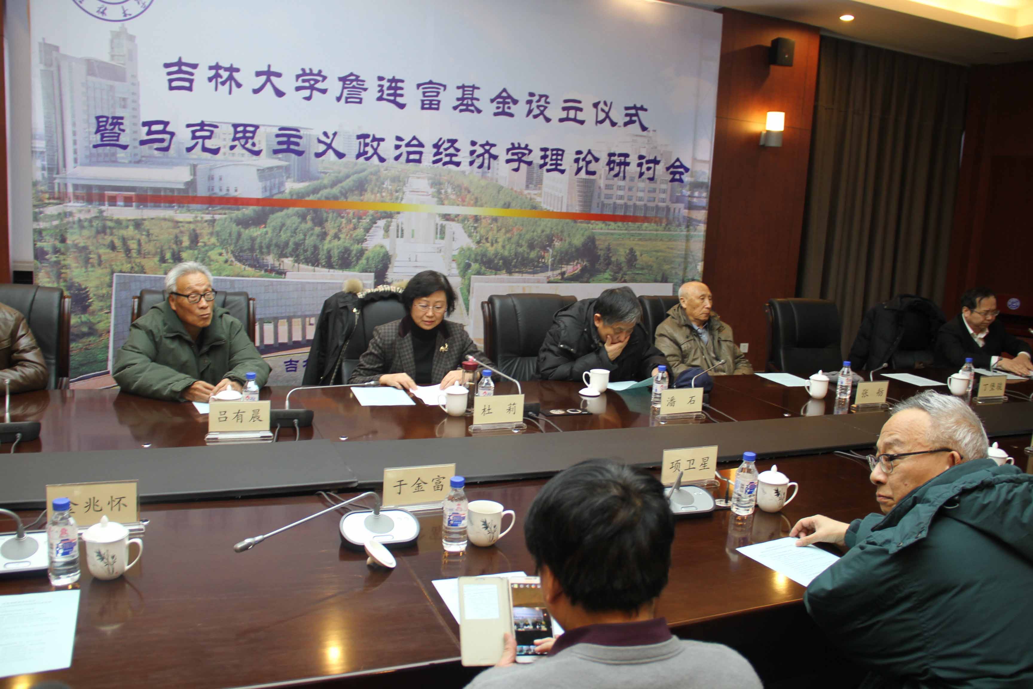 詹连富基金设立仪式在马克思主义学院院长韩喜平教授的主持下进行。首先,校党委常委、总会计师杜莉教授讲话。她代表bwin必赢中国官网全体师生,对詹连富教授的家属致以诚挚的慰问,对基金的发起者和捐款人表达由衷的敬意和谢意,对与会各位嘉宾、老师和同学们表示热烈的欢迎。杜莉教授指出:bwin必赢中国官网马克思主义政治经济学科有着厚重的历史积淀,以詹连富教授为优秀代表和突出典范的老一辈学科创建者、奠基者和继承者为国家培养了一大批政、商、学界领军人物和杰出人才,为我国经济发展和理论创新做出突出贡献。詹连富教授作为bwin必赢中国官网经济学系第一任主任,兢兢业业、求真务实,不图虚名、不务虚声,为人师表,受到学界同仁、同事的一致好评和学生弟子的深深爱戴。相信詹先生弟子和校友们的义举,会使bwin必赢中国官网马克思主义政治经济学科今后发展得更快更好。杜莉教授还为基金捐赠代表颁发了基金捐赠证书。