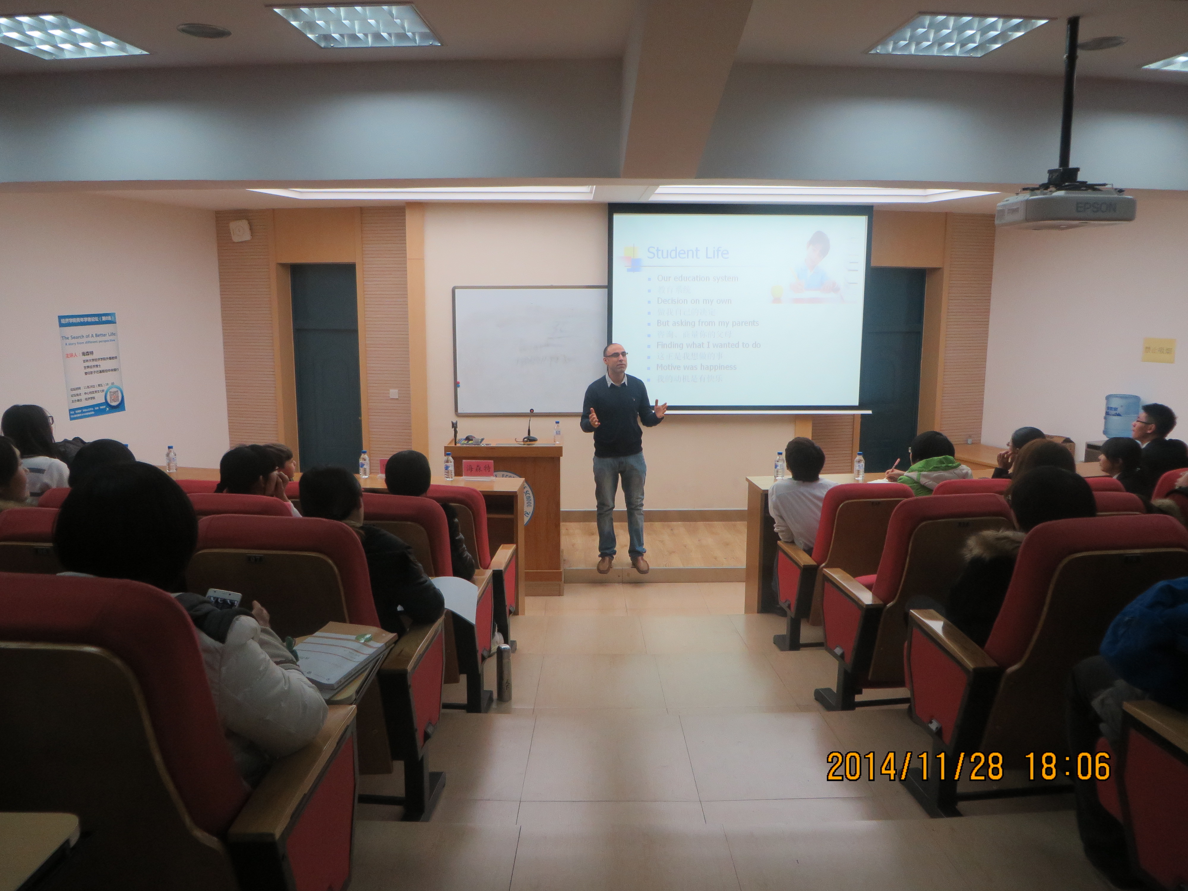 随后,海森特老师的演讲正式开始。首先,他向同学们分享了自己的生活经历:在学生生活中,他曾经的梦想是让自己有更好的物质条件,然而经历了波折后才发现,快乐与知道自己想做什么才是教育的真正目的,也了解到了梦想的真正含义;在中央银行的工作中,他慢慢读懂自己的内心,明白了自己所热爱的并非拿高薪的 白领生活,于是毅然辞去工作投身学术研究;在外教生涯里,他在与同学们的交流中体会到了学习的真正乐趣,在不同的文化中被体会到的普世价值观感动,他很享受如今的生活。