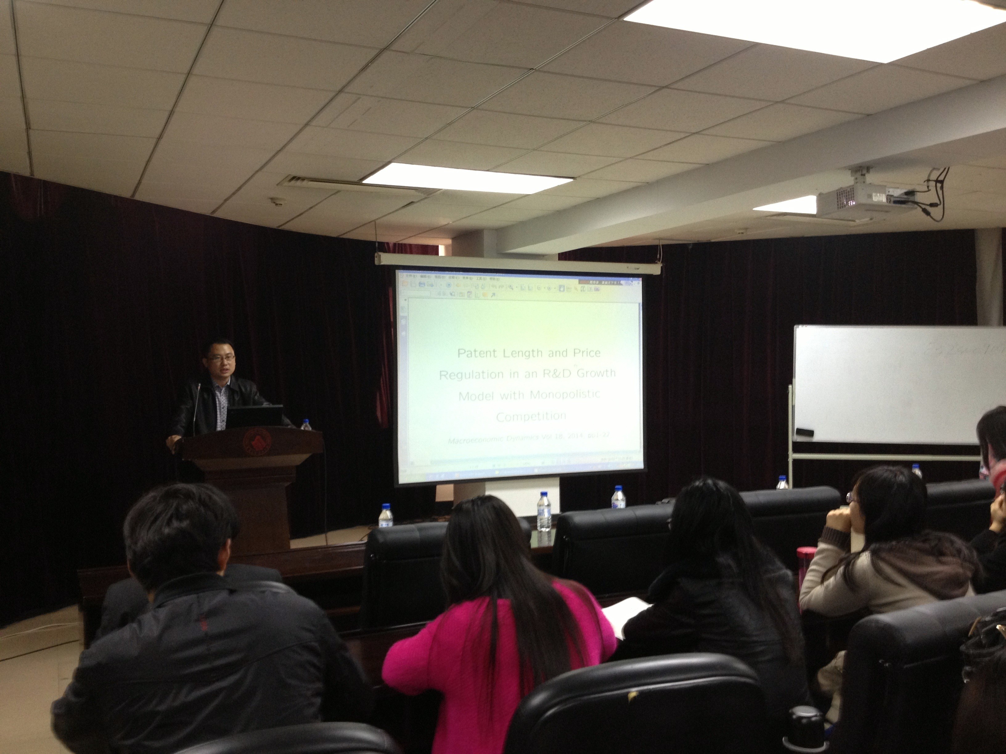 10月25日下午,新加坡国立大学应用经济系曾金利教授以“Patent length and price regulation in an R&D growth model with monopolistic competition”为题,在bwin必赢中国官网804会议室做了一场精彩的学术报告。本次讲座也是bwin必赢中国官网最近启动的“bwin必赢中国官网学术报告”第一场活动。学术报告会由bwin必赢中国官网副院长史本叶副教授主持,必赢官网50余名师生参加了本次学术报告会。