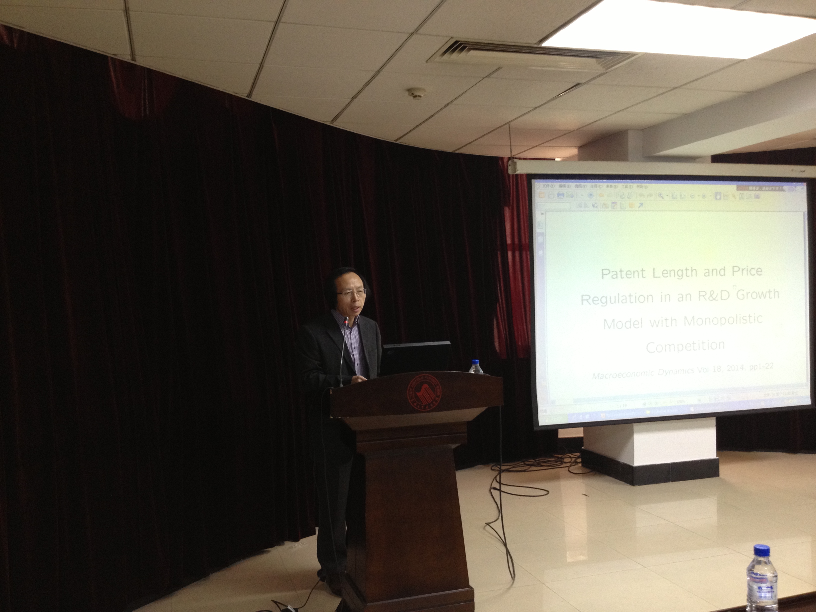 曾金利教授早年曾获得加拿大西安大略大学经济学博士学位,现任新加坡国立大学应用经济系教授,主要研究方向包括宏观经济学、经济增长、发展经济学、公共经济学等。在报告会上,曾金利教授从专利保护和价格管制的矛盾出发,分别从经济增长最大化和福利最大化两方面入手,通过建立垄断竞争下的R&D增长模型和进行严格的数学推导,最终得出要实现经济增长最大化就应采取无限期的专利保护制度,而要实现福利最大化就应采取低于垄断价格的价格管制,如果同时兼顾经济增长和提高福利水平,那么采取有限期的专利保护和适度的价格管制就成为一种“最优”选择,这也解答了讲座时开始提出的政府为什么可能制定这看似“矛盾”的一组政策。这一结论对于制定正确的专利保护政策和发展良性的产品消费市场具有深刻的启发意义。