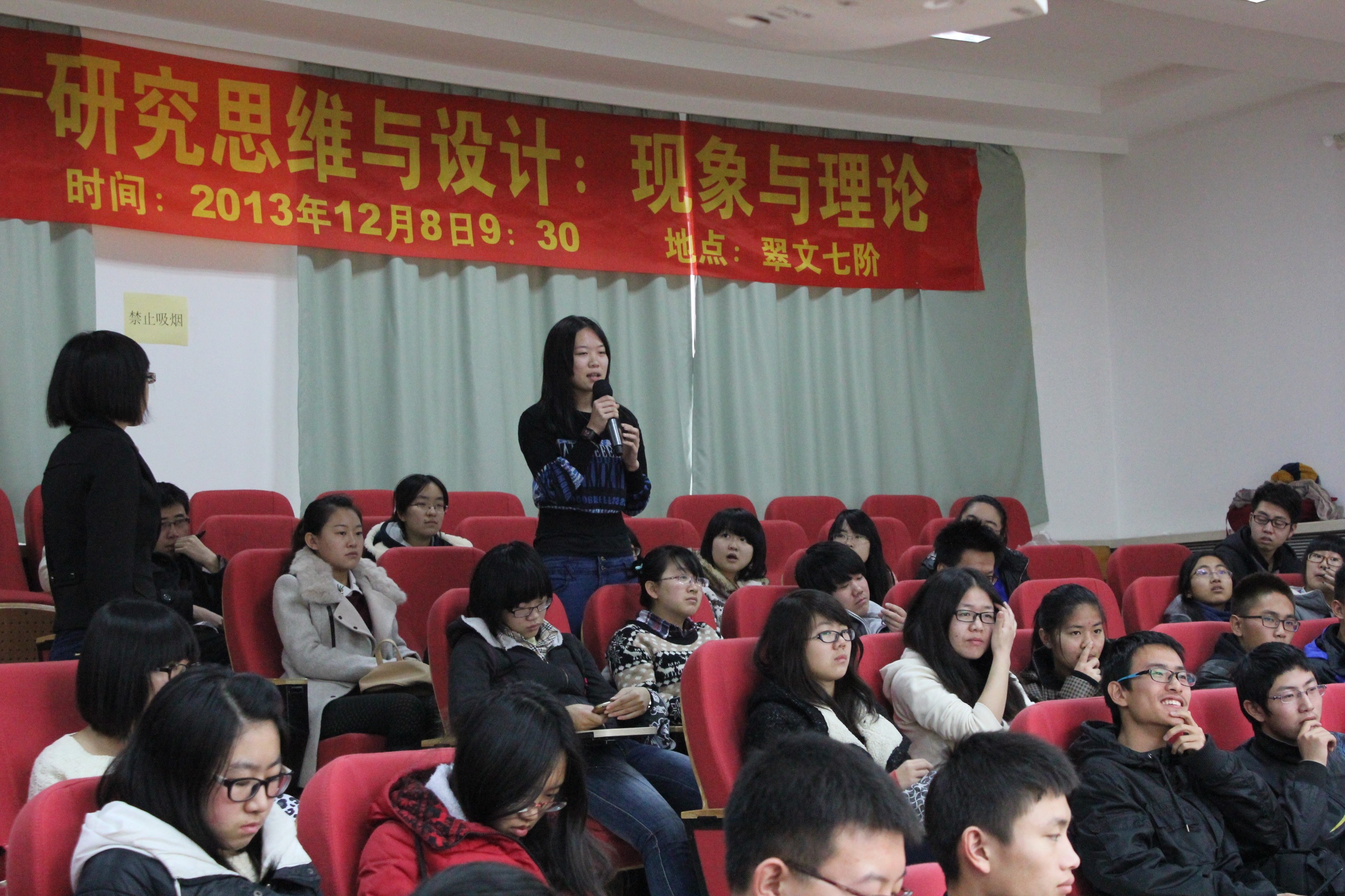 接着,杨俊副教授做了题为“研究思维与设计:现象与理论”的演讲。他的讲座围绕四个词展开。第一个词为:转型。在这个重要的转型时期,中国若要缩短与发达国家的差距,就应该改变认识。第二个词:思维。杨老师强调大学生应该勤动脑筋来锻炼思维。摆脱传统教育带来的固定思维模式,学会质疑,才能创新。第三个词:研究。研究有利于带来更广阔的思维空间。第四个词:奉献。有的人将大学时光奉献给娱乐,最终他们会丧失自己的态度和习惯和态度;有的人将自己奉献给学分,但这些人并一定获得成功,因为学分与成功呈倒U型曲线;有的人将自己奉献给对未来的思考和研究,这将会给他们带来成功。