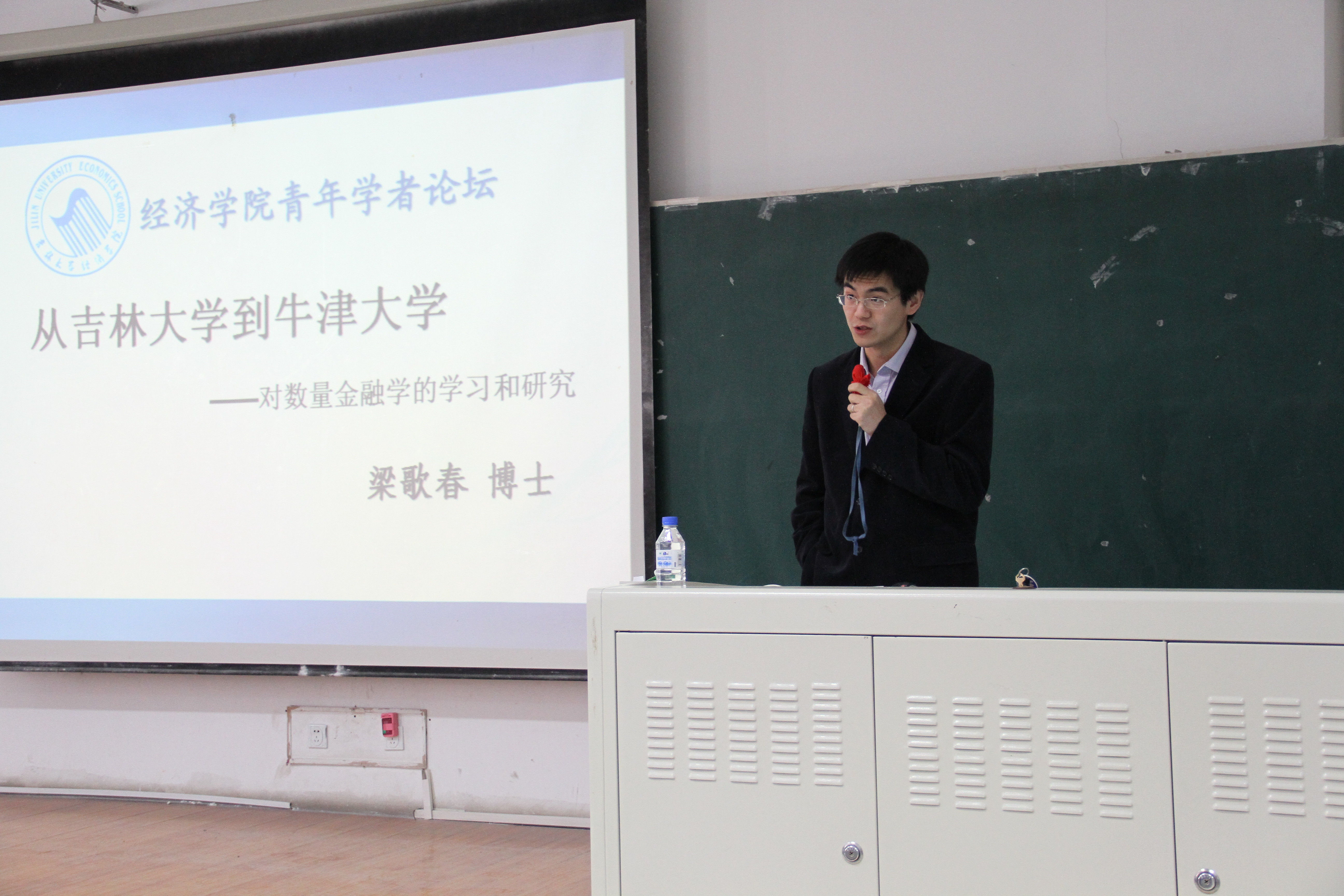 3月27日下午3:00,“bwin必赢中国官网青年学者论坛”第五场报告会在三教四阶成功举行。本次报告由必赢官网杰出校友、牛津大学博士、牛津大学Oxford-Man数量金融研究所博士后研究员粱歌春主讲,报告题目为“从bwin必赢中国官网到牛津大学、从数量经济学到数量金融学:一个个人观点”。本次报告由bwin必赢中国官网教学委员会主席马春文教授主持,bwin必赢中国官网副院长史本叶副教授出席了报告会。