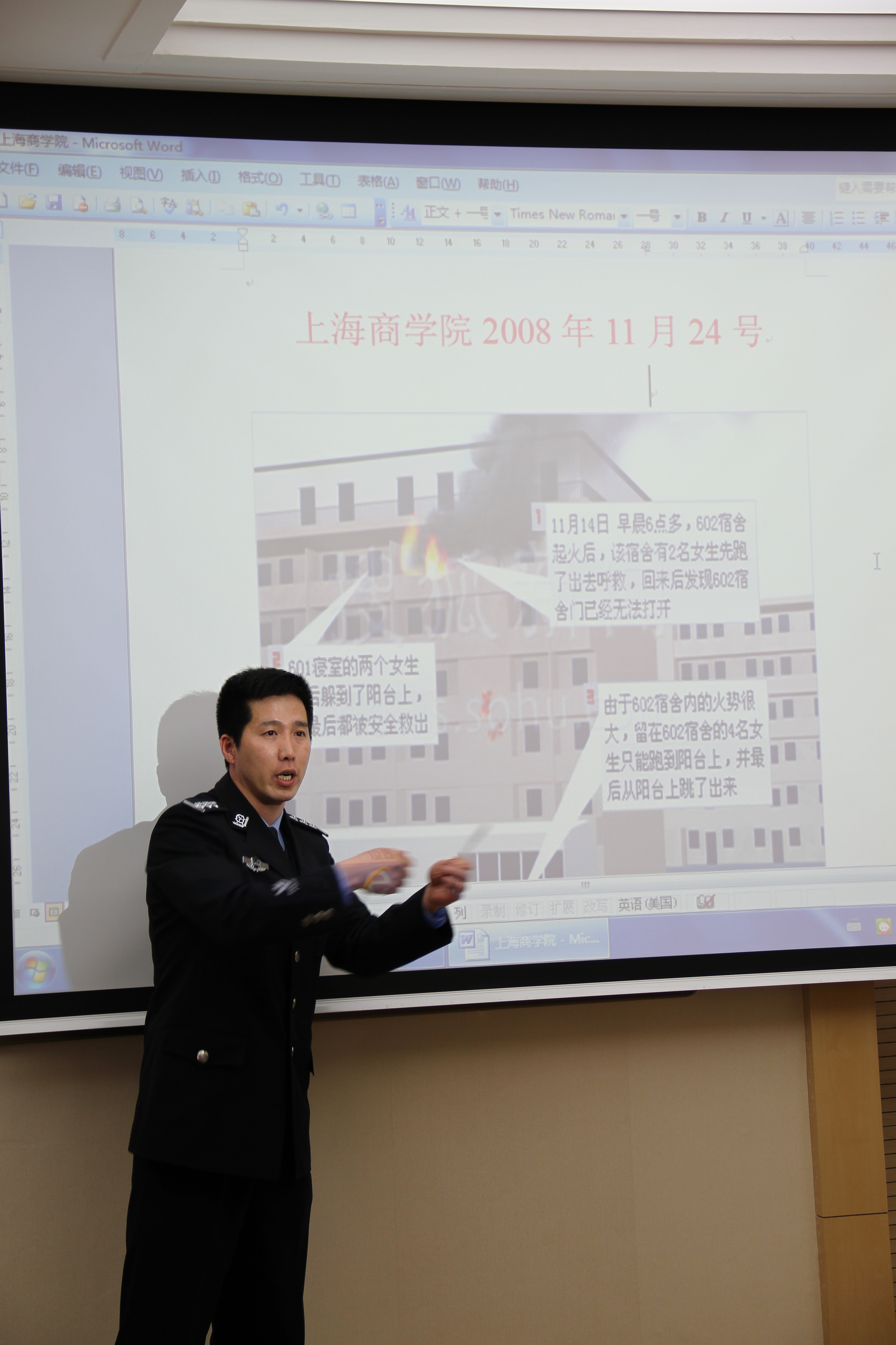 随后,校保卫处防火科副科长周中平为与会人员做了消防安全知识专题讲座。周科长通过讲解近年来国内省内校内发生的重大火灾事故及案例,诠释了火灾的无情,让师生们从中吸取了经验和教训。在讲座中周警官重点强调了建立消防安全的“四个能力”,还向在场师生演示了灭火器的使用方法,讲解了日常生活中存在的火灾隐患问题。