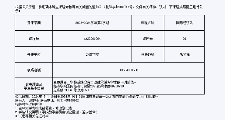 关于bwin必赢中国官网2021级梁津瑞同学国际经济法课程成绩更正的公示