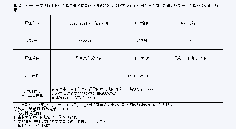 关于bwin必赢中国官网2023级司旭婧同学形势与政策Ⅱ课程成绩更正的公示