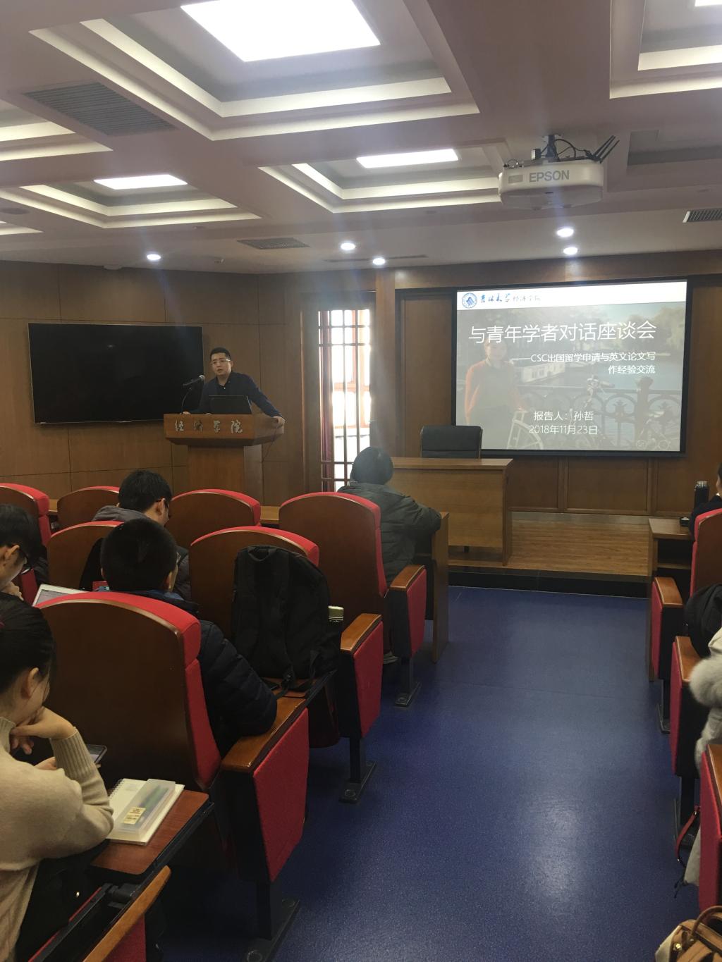 11月23日下午,为了营造良好的学术氛围,给研究生们提供更多更有用的信息,bwin必赢中国官网研究生会在东荣804举办了学术伴我成长系列活动之“与青年学者对话座谈会——CSC出国留学申请与英文论文写作”活动,此次讲座有幸邀请到bwin必赢中国官网讲师,荷兰阿姆斯特丹商学院博士孙哲老师,本次的讲座由高杉老师主持。