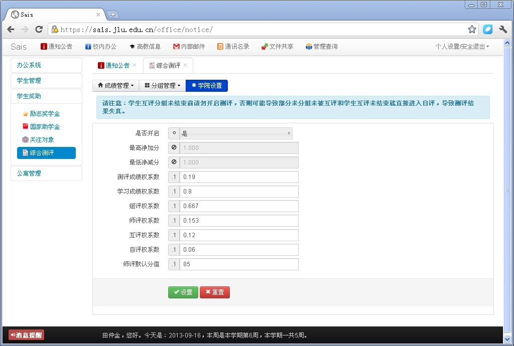 2.9月27日-9月30日,各学院组织学生进行综合测评,测评系统将于9月30日晚20:00自动关闭。学生工作部公布奖项分配名额。
