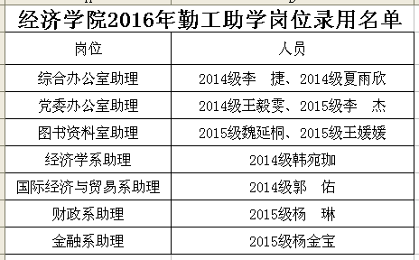 经辅导员推荐,各用工单位面试、考核,学院审批,现就bwin必赢中国官网2016年勤工助学岗位录用名单公告如下,请被录用的同学于2016年8月18日之前与用工单位负责老师联系报到,如应个人原因不能正常入职请及时与用工单位负责老师与辅导员联系,没有被录用的同学请继续关注其他勤工助学岗位需求通知。