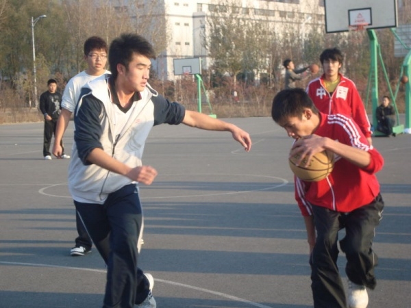图为3V3篮球赛决赛中大一的蚂蚁队对阵大二的小细腿队